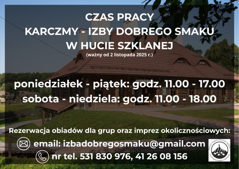 Bez kategorii Czas pracy Karczmy – Izby Dobrego Smaku w okresie jesienno – zimowym, ważny od 2 listopada 2025 r. km_adm 2025-11-04