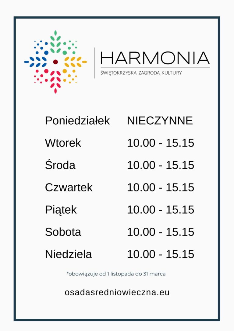 Bez kategorii Czas pracy Harmonii – Swiętokrzyskiej Zagrody Kultury w okresie jesienno – zimowym, ważny od 2 listopada 2025 r. km_adm 2025-11-04