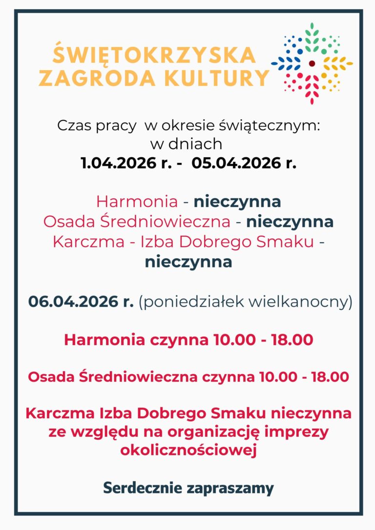 Czas pracy Świętokrzyskiej Zagrody Kultury w okresie świątecznym